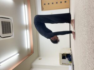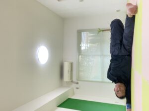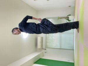 今回は座ってやるストレッチ。片足を曲げて体重をやや斜め後ろにかけながらストレッチします。ヨガのポーズの中で、両膝を曲げて後ろに寝るやり方がありますが、膝や腰を痛める可能性があるためおすすめしません。片