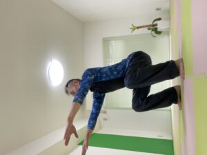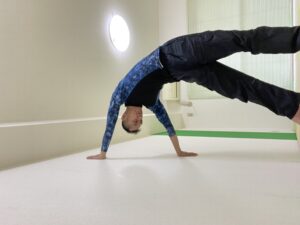 骨盤の動きが良くなるように、腰の柔軟性も同時につけていきましょう。写真のポーズは、太もものストレッチと腰のひねりが同時に出来ます。キツければ、伸ばす脚を少し曲げてやっていただければいいです。伸ばした脚