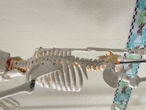 この模型で、よく分かると思います。背骨の横から黄色く出ているのが、脊髄神経です。この神経が筋肉や内臓を動かしています。視覚や聴覚などの五感も司っています。命をつなぐ神経になりますので、決して傷つけて