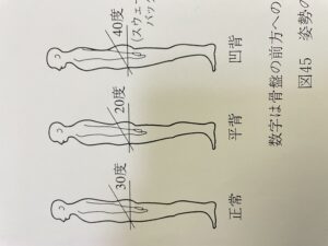この画像が骨盤の角度差になります。正常は30度。平背は20度前後平ら腰です。「下腹がら緩みやすい」40度前後になると反り腰になります。「腰痛を起こしやすい」生まれつき乗る場合もあるので難しい事ではある