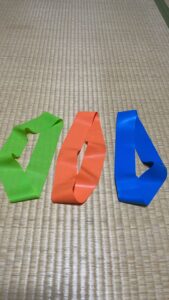 最近、ヨガの中で使うようになりました。100均のトレーニングチューブ。90分のコースの中で、10分程度利用しています。目的はインナーマッスルの強化です。肩、腕周辺、股関節や膝にかがわる筋肉の強化に使っ
