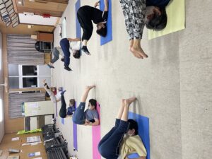この教室の方々は、腰がちゃんと上がっています。良く頑張っていただいていますよ。逆転のポーズは、全身の鬱血防止、背中や、腰の柔軟性維持、血圧の安定、肩や首の凝りの予防など、さまざまな効果がありますので、